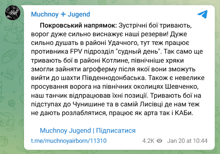 На Покровском направлении продолжаются встречные бои. По словам бойца ВСУ с позывным "Мучной", враг очень сильно истощает резервы Сил обороны. Особенно в районе Удачного, где действует его FPV-подразделение "Судный день".