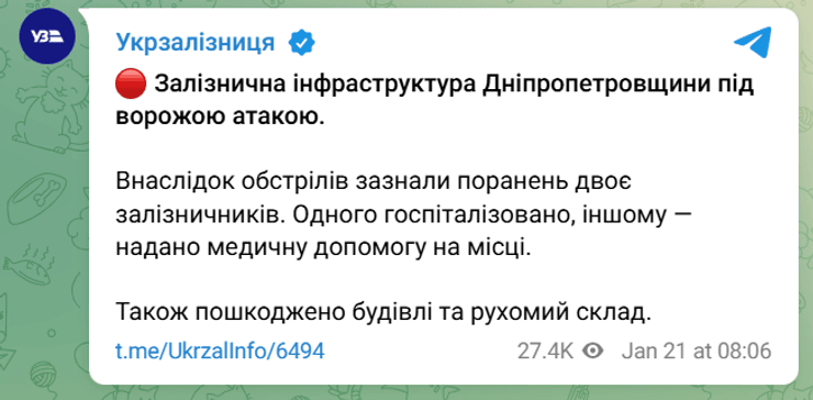Во вторник утром, 21 января, Российская Федерация атаковала железнодорожную инфраструктуру в Днепропетровской области. Председатель правления "Укрзалізниці" Александр Перцовский сообщил о трех раненых железнодорожниках.