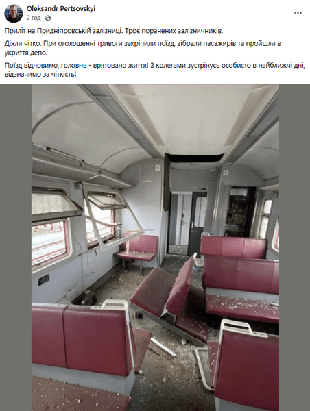 Перцовский отметил, что работники "действовали четко". После объявления воздушной тревоги закрепили поезд, собрали пассажиров и прошли в укрытие депо.