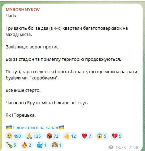 Вооруженные силы РФ полностью уничтожили город Часов Яр в Донецкой области и захватили 2 квартала. Об этом пишет журналист Богдан Мирошников.