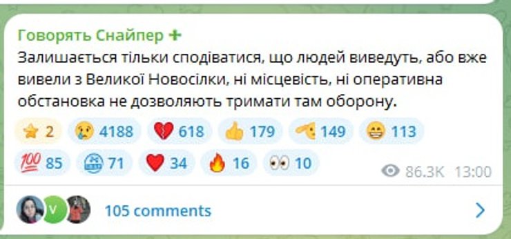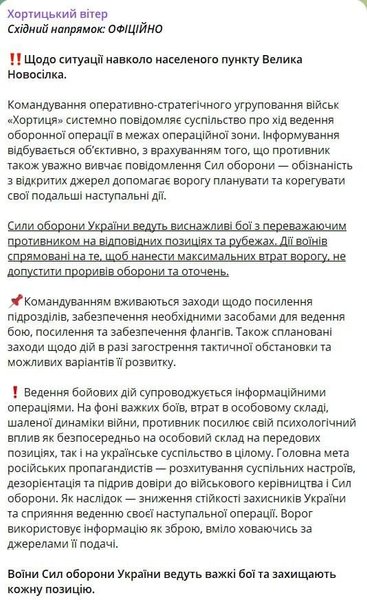 В командовании распространение информации о формировании котла в Великой Новоселке назвали информационной операцией врага, чтобы расшатать общественные настроения, дезориентировать и подорвать доверие к военному руководству и Силам обороны.