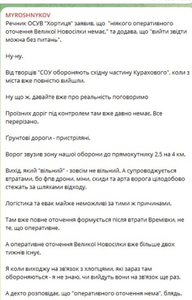 "Логистика и эвак почти невозможны по тем же причинам. Там уже полное окружение формируется после потери Временки, не то, что оперативное. А оперативное окружение Великой Новоселки уже больше двух недель существует. Я когда выхожу на связь с ребятами, которые сейчас там обороняются — я не знаю, выйдут ли они на связь еще раз. А некоторые рассказывают, что "оперативного окружения нет", бл*дь", — написал он.
