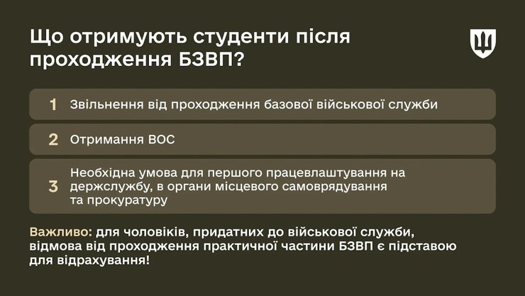 После прохождения БОВП студенты будут принимать военную присягу и получат сертификат и военно-учетную специальность. Это освободит их от прохождения обязательной военной службы, которую должны пройти все мужчины в возрасте 18-25 лет. Также прохождение БОВП будет необходимым условием для первого трудоустройства на государственную службу, в органы местного самоуправления и прокуратуру.