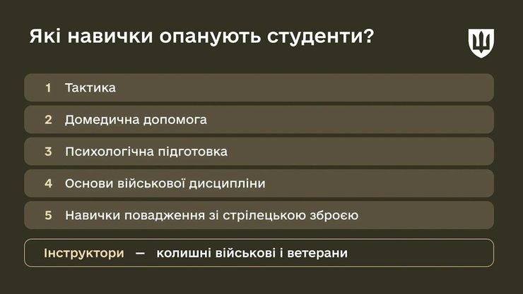 Во время подготовки студенты дневной и дуальной форм обучения получат базовые знания по тактике, домедицинской помощи, психологической подготовки, основ воинской дисциплины, международного гуманитарного права и навыки обращения со стрелковым оружием. Основной акцент будет сделан на практических аспектах, в частности тренировке в использовании оружия, ориентировании на местности и обеспечении собственной безопасности в условиях боевых действий и тому подобное.