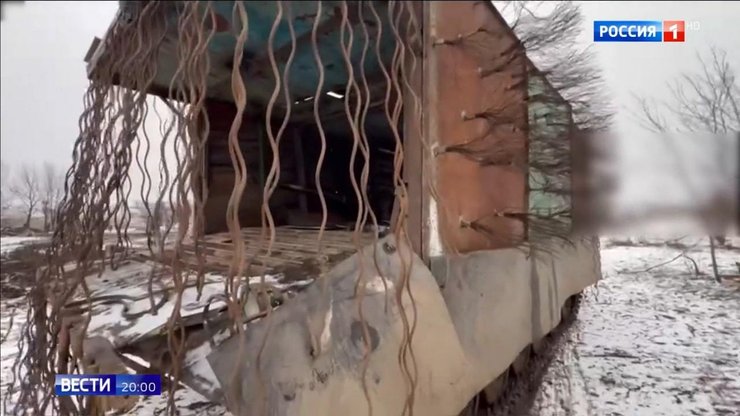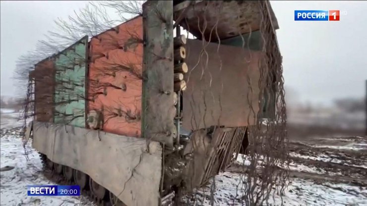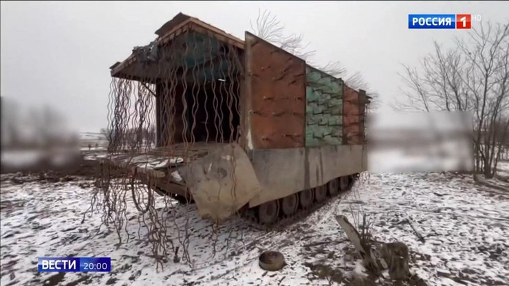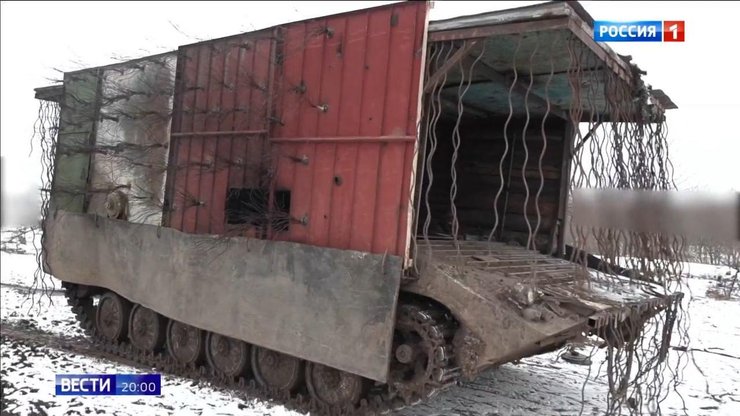 Военная техника, несущая на себе дополнительное бронирование, засветилась в одном из сюжетов российских СМИ. Передвижной "сарай" катается в районе Часового Яра в Донецкой области.