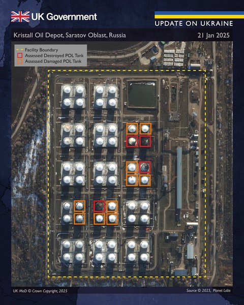 Разведка показала спутниковый снимок нефтебазы, датированный 21 января, на котором, по оценкам, заметно 4 уничтоженных цистерны с ГСМ и 10 поврежденных резервуаров.