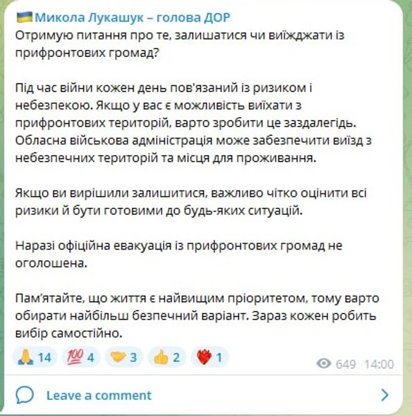 "Во время войны каждый день связан с риском и опасностью. Если у вас есть возможность выехать из прифронтовых территорий, стоит сделать это заранее. Областная военная администрация может обеспечить выезд из опасных территорий и места для проживания. Если вы решили остаться, важно четко оценить все риски и быть готовыми к любым ситуациям", — написал он.