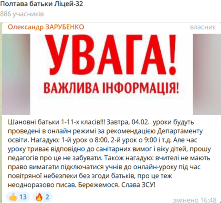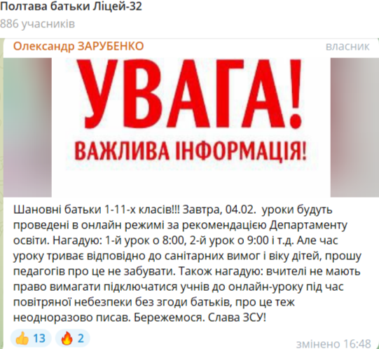 В Telegram-канале "Полтава родители Лицей-32" также существует сообщение о том, что 4 февраля уроки будут проведены в онлайн режиме. Там отмечается, что такую рекомендацию предоставил Департамент образования.
