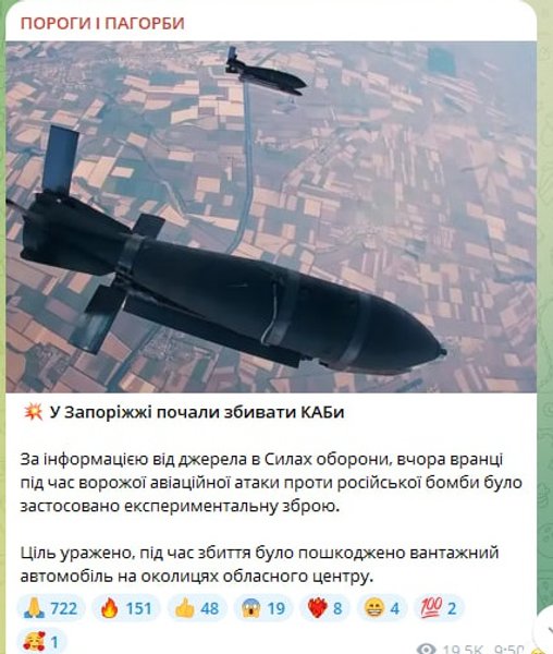 Украинские защитники впервые смогли сбить управляемую авиабомбу, которую запустили ВС РФ по Запорожью. Об этом пишут в телеграм-канале "Пороги и холмы" со ссылкой на свои источники в Силах обороны.