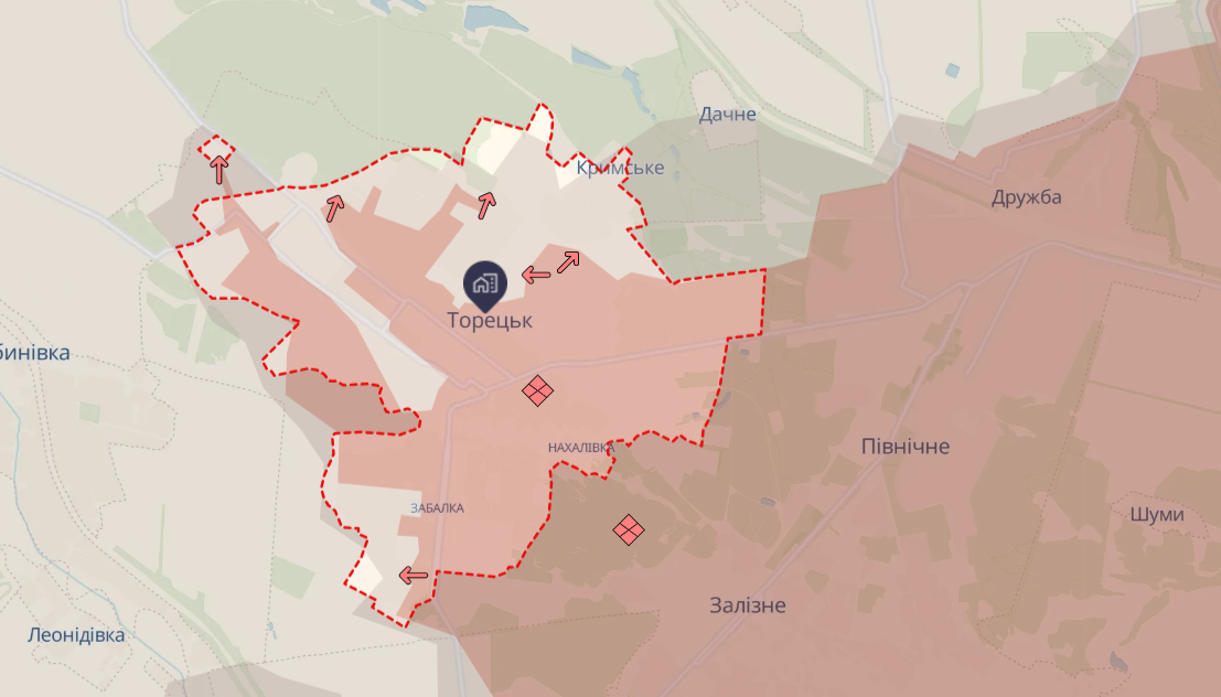 Команда аналитиков Deep State представила карту, где большая часть Торецка оказалась под контролем ВС РФ или в серой зоне. Также есть небольшие участки на окраинах, которые удерживают ВСУ.