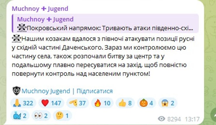 "Нашим казакам удалось с севера атаковать позиции р*сни в восточной части Даченского. Сейчас мы контролируем эту часть села, также начали битву за центр и в дальнейшем плавно передвигаться на запад, чтобы полностью вернуть контроль над населенным пунктом", — проинформировал он.