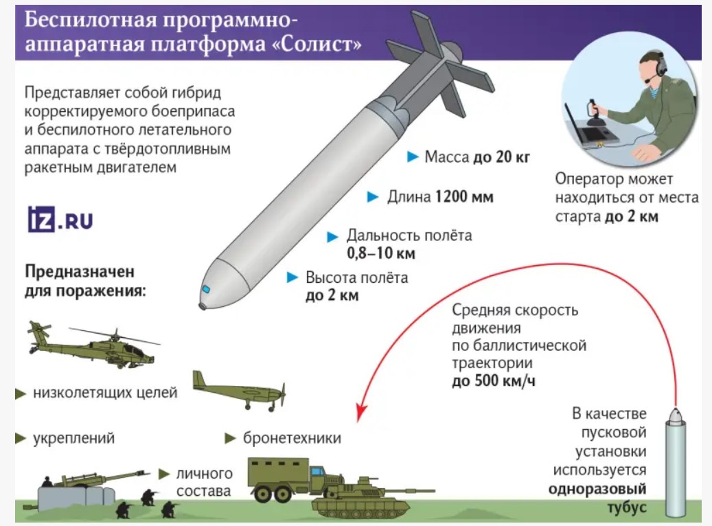 Российские инженеры предприятия "Кизлярский электромеханический завод" (КЭМЗ) презентовали разработку "Солист", который представляет собой гибрид беспилотника и корректируемого боеприпаса с реактивным двигателем. В российских СМИ сообщили, что боеприпас уже прошел испытания на одном из полигонов на оккупированной территории Донецкой области.