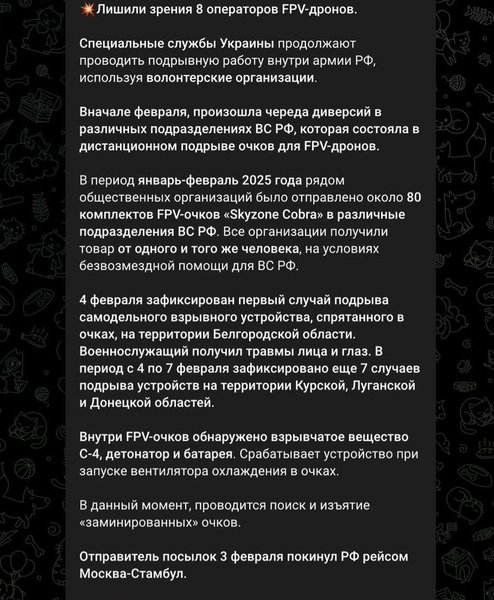 "В начале февраля, произошел ряд диверсий в различных подразделениях ВС РФ, которая заключалась в дистанционном подрыве очков для FPV-дронов. 4 февраля зафиксирован первый случай подрыва самодельного взрывного устройства, спрятанного в очках на территории Белгородской области. Военнослужащий получил травмы лица и глаз. В период с 4 по 7 февраля зафиксировано еще 7 случаев подрыва устройств на территории Курской, Луганской и Донецкой областей", — говорится в сообщении.