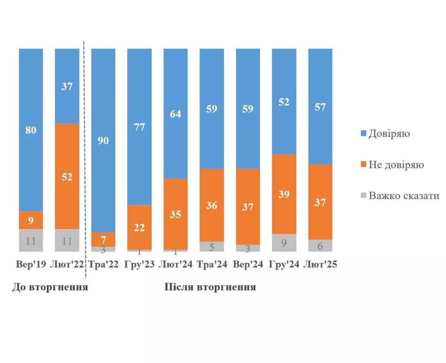 Bloomberg отмечает, что доверие людей к Зеленскому, которое постепенно падало в течение последних трех лет, восстановилось до 57% в феврале, когда Трамп начал "класть на весы" Украину. Согласно опросу Киевского международного института социологии (КМИС), это первое улучшение с момента пика его популярности в мае 2022 года после начала широкомасштабного вторжения России.