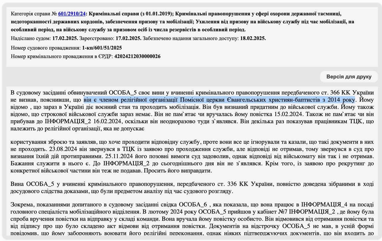 Не пришел в ТЦК: суд признал баптиста виновным в уклонении от призыва, как его наказали