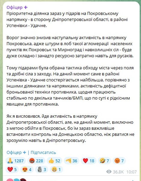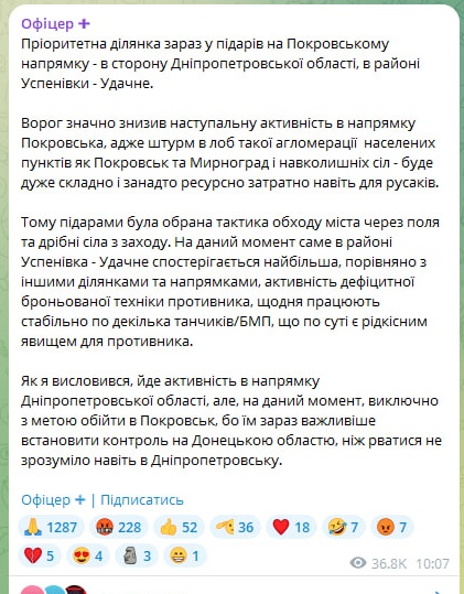 "Как я выразился, идет активность в направлении Днепропетровской области, но, на данный момент, исключительно с целью обойти Покровск, потому что им сейчас важнее установить контроль на Донецкой областью, чем рваться на Днепропетровщину", — написал "Офицер".