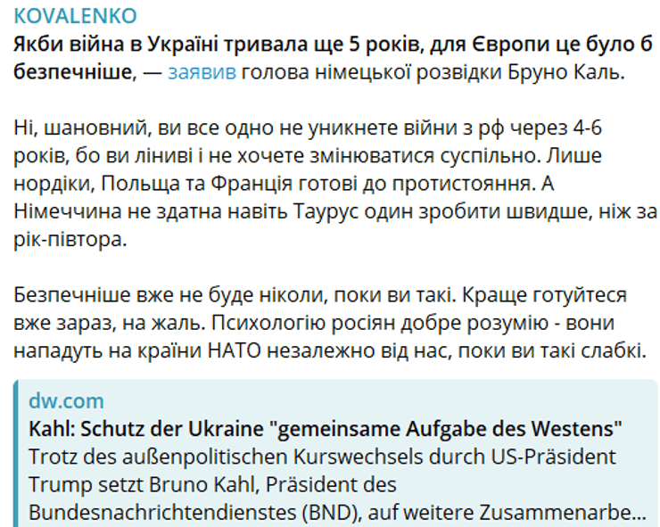 Руководитель ЦПД СНБО отметил, что пока немцы остаются такими, безопаснее для них не будет никогда. Поэтому он посоветовал не ждать, пока в Украине не закончится война, а готовиться к нападению Москвы уже сейчас.