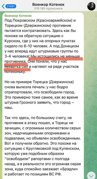 "Под Покровском и Торецком противник пытается контратаковать. Здесь похоже на обратную ситуацию с Курском, где у них на опорных пунктах сидело по 6-10 человек. А под Донецком у нас вперед идут штурмовые группы по 3-4 человека. Мы истощились не меньше противника. Они поняли, что у нас нехватка сил и наглеют на ряде участков потихоньку", — написал Котенок.