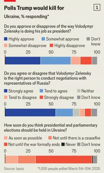 "Украинцы сплачиваются вокруг своего президента так, о чем господин Трамп мог только мечтать. Опрос показывает, что 72% украинцев полностью или частично одобряют работу своего президента; По данным трекера The Economist, поддержка Трампа составляет 46%. 62% опрошенных украинцев отвергают выборы до официального окончания войны. Еще 19% рассматривали бы их только во время прекращения огня. Только 14% согласны с Белым домом, что они должны состояться как можно скорее", — пишет The Economist.