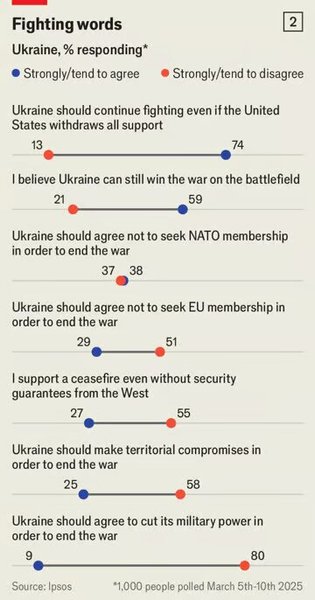 "Несмотря на ухудшение перспектив, это показывает, что украинцы находятся в таком же упрямом настроении, как и их президент. Огромное большинство (74%) выступает за то, чтобы бороться даже без американской поддержки. Убедительное большинство (59% против 21%) утверждают, что они верят, что Украина все еще может победить на поле боя", — пишет издание.
