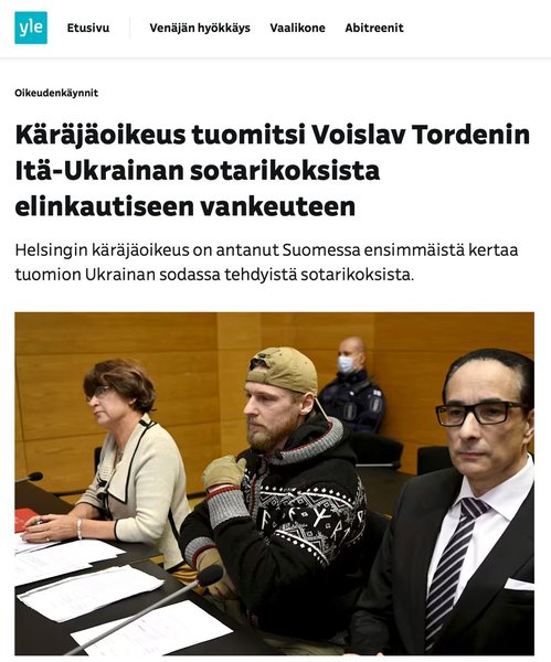 Окружной суд Хельсинки впервые в Финляндии вынес приговор за военные преступления, совершенные во время войны в Украине. Прокурор требовал для Тордена пожизненного заключения за пять военных преступлений. Районный суд отклонил одно обвинение.
