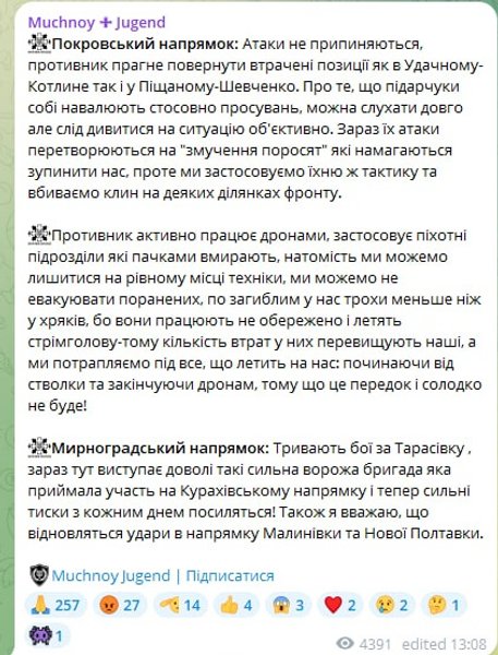"Сейчас их атаки превращаются в "замучение поросят", которые пытаются остановить нас, однако мы применяем их же тактику и убиваем клин на некоторых участках фронта", — проинформировал "Мучной".