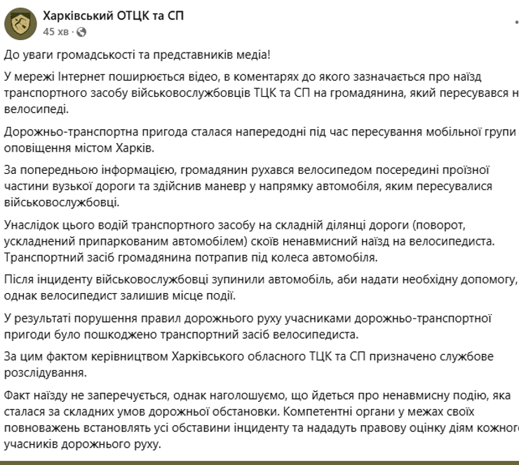 Харьковский областной территориальный центр комплектования и социальной поддержки отреагировал на сообщения СМИ об инциденте в Харькове, в ходе которого работники военкомата наехали на велосипедиста. Соответствующее сообщение появилось на Facebook ОТЦК.