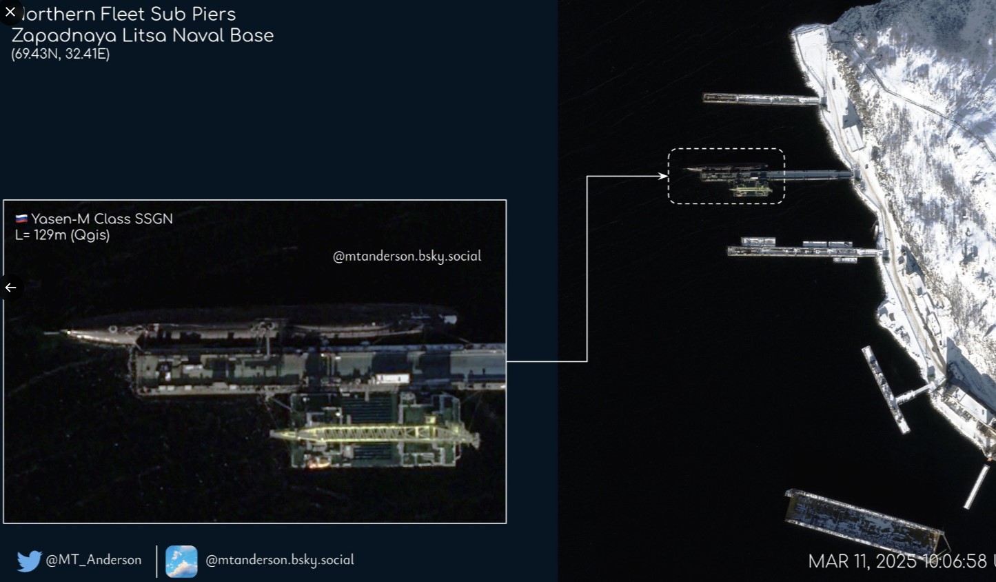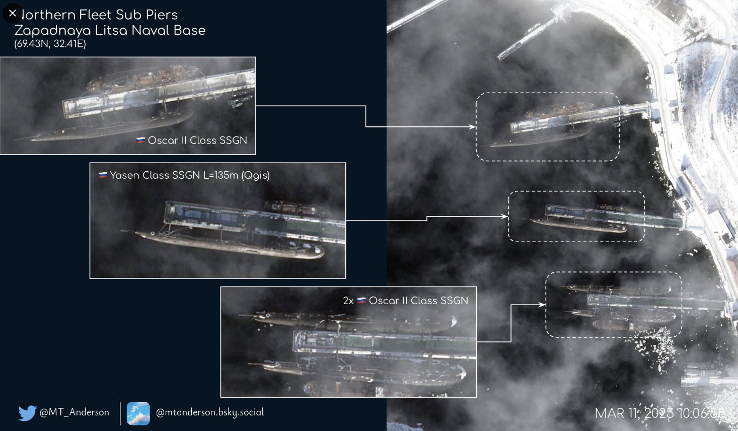Недавние спутниковые снимки зафиксировали значительное сосредоточение российских подводных сил на секретной базе Западная Лица, расположенной на Кольском полуострове вблизи границы с Норвегией. На изображениях, опубликованных 18 марта OSINT-аналитиком MT Anderson, отчетливо видны пять атомных подводных лодок (АПЛ): три проекта 949А(М) "Антей", одна проекта 885 "Ясень" и одна усовершенствованная "Ясень-М".