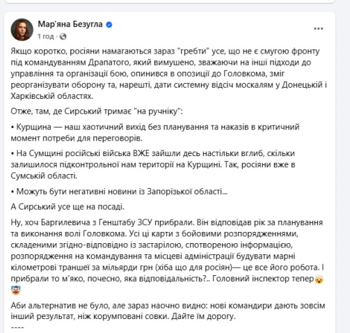 17 марта Безуглая заявила, что отступление украинских войск с Курщины не было запланировано и военнослужащие не получают приказов о выходе.