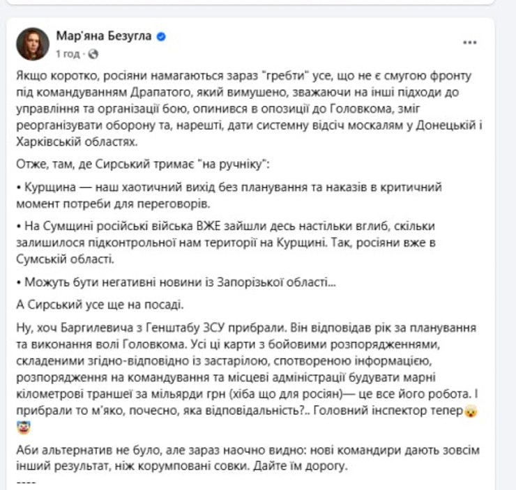 В событиях на Сумщине депутат традиционно обвинила главкома ВСУ Александра Сырского.