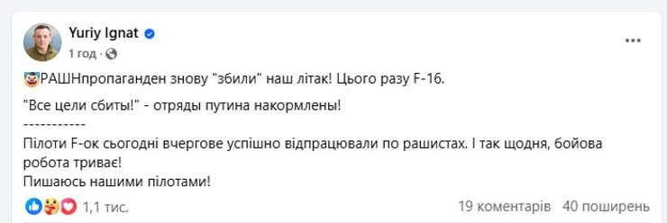 "Рашнпропаганден снова "сбили" наш самолет! На этот раз F-16. Пилоты F-ок сегодня в очередной раз успешно отработали по р*шистам. И так каждый день, боевая работа продолжается. Горжусь нашими пилотами", — написал на своей странице в "Фейсбук" начальник управления коммуникаций командования Воздушных сил Вооруженных сил Украины Юрий Игнат.