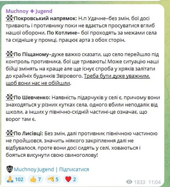 "Покровское направление. Удачное — без изменений, бои до сих пор продолжаются и противнику пока не удается продвигаться вглубь нашей обороны. По Котлиному — бои проходят за пределами села и восточнее в промке, работает арта с обеих сторон. По Песчаному — очень трудно сказать, что село перешло под контроль противника, бои еще продолжаются", — проинформировал он.