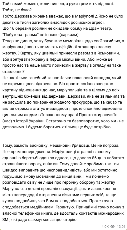 "Мариупольцы страшны в своем единении в борьбе друг за друга, что доказало 86 дней сопротивления гораздо более страшному врагу, чем вы. Поэтому давайте сделаем так — вы быстро исправите эту несправедливость, или мы окончательно нарушим заговор молчания до конца войны. И мы начнем рассказывать миру не только о героической обороне и жертве Мариуполя, а детали провалов эвакуации, факты успокоения города накануне вторжения визитами первых лиц и еще кучу подробностей, которые вам не понравятся", — написал мариуполец.