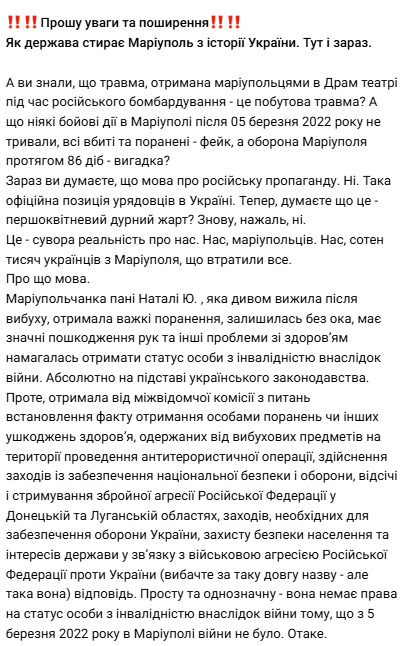 Руководитель "Центра изучения оккупации" Петр Андрющенко утверждает, что жительнице Мариуполя отказали в предоставлении статуса лица с инвалидностью вследствие войны, аргументировав это тем, что в городе не продолжались бои после 5 марта 2022 года. Он требует у власти исправить несправедливость, а в противном случае угрожает рассказать неприятные факты об обороне Мариуполя. Официальной реакции представителей правительства на момент публикации материала не было.