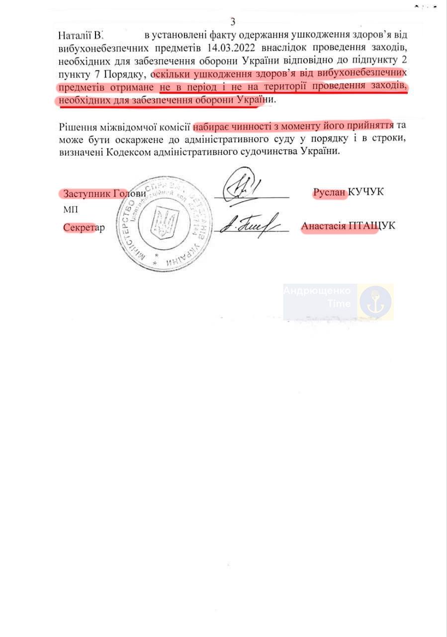 В опубликованном им документе указано, что Наталье "отказано в установлении факта получения пострадавшим лицом ранения или иного повреждения здоровья, полученного от взрывоопасных предметов на территории мероприятий, необходимых для обеспечения обороны Украины, защиты населения и интересов государства" на основании того, что повреждения были получены "не в период и не на территории" проведения этих мероприятий.