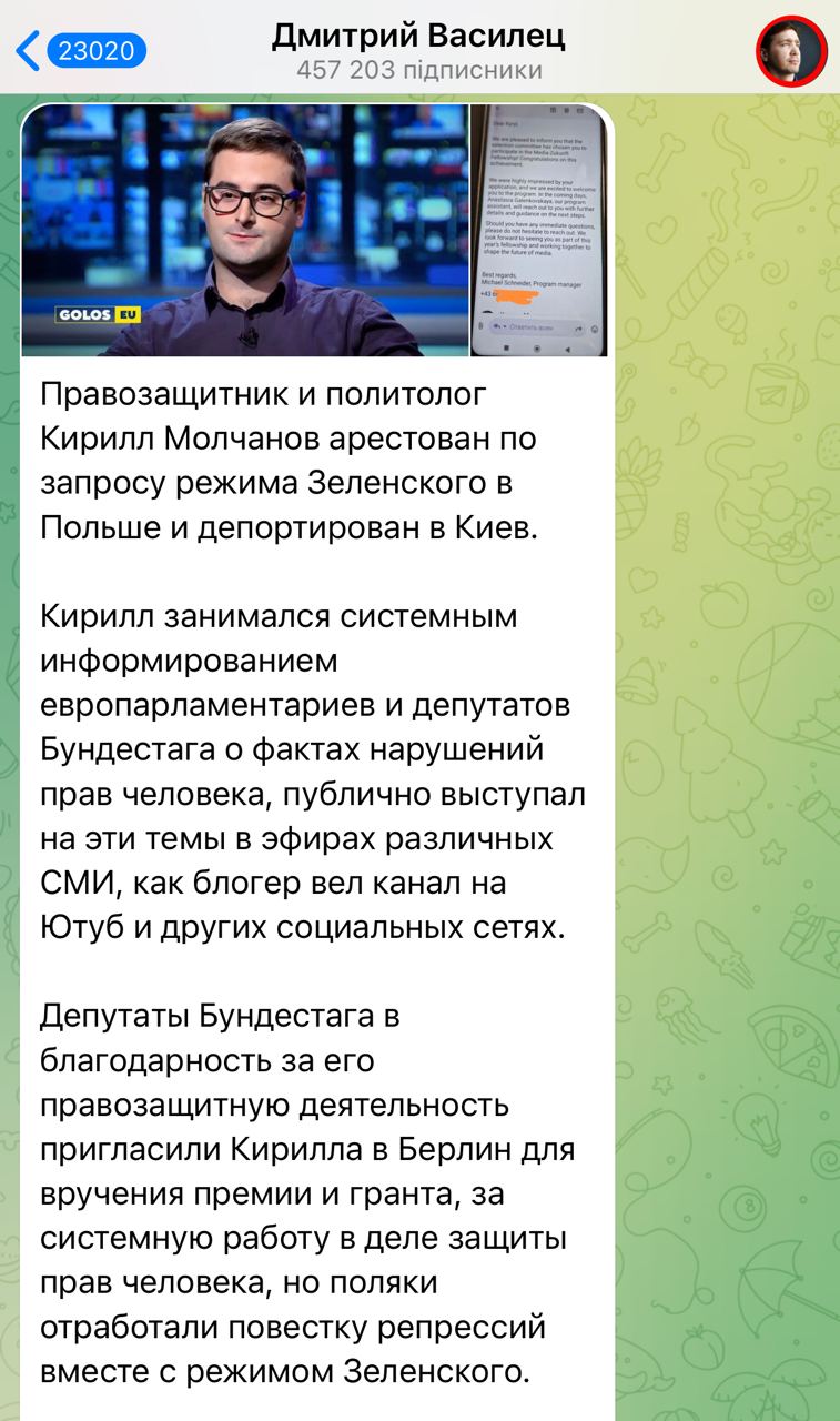 На задержание российского агента также отреагировал украинский журналист Денис Казанский. Казанский привел скриншот Telegram-канала, в котором есть некоторые детали задержания Молчанова. Как выяснилось, политтехнолог после начала войны сбежал в РФ, но в какой-то момент получил письмо из Германии. В письме говорилось о том, что его приглашают на получение гранта Бундестага. Фигурант ничего не заподозрил и отправился за деньгами, пояснил другой пропагандист — Дмитрий Василец. Когда Молчанов оказался в Польше, его задержали украинские спецслужбы, говорится в заметке Казанцева.
