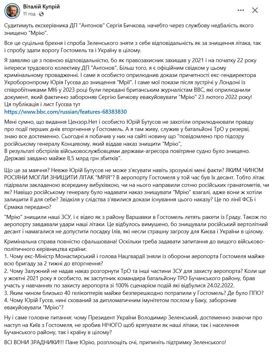 "Мрию" уничтожили наши ВСУ, и есть видео как из района Варшавки в Гостомель летят ракеты из "Града". Также по аэропорту наносили удары наши самолеты. Это произошло вынужденно, потому что уничтожали российский вертолетный десант и пытались не допустить посадку "Илов", которые несли страшную угрозу для Киева и Украины в целом", — написал он.