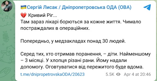 Руководитель Центра противодействия дезинформации Андрей Коваленко сообщил, что россияне сознательно пытались убить как можно больше людей, ведь ударили по Кривому Рогу кассетной баллистической ракетой, предварительно — "Искандером".