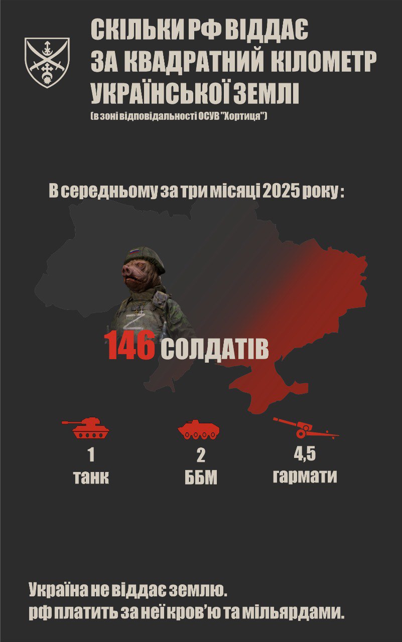 С начала 2025 года Российская Федерация захватила часть территории Украины. За три месяца 2025 года в среднем за каждый квадратный километр украинской земли Россия потеряла 146 солдат, танк, две боевые бронированные машины и 4,5 пушки.