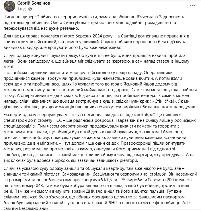 "Убийство Синегубова должно было быть публичным. Диверсант ждал очередного российского обстрела по жилому дому с большим количеством жертв харьковчан. Адрес заблаговременно ему должны были сообщить кураторы из России. По его плану, атаковать он должен был, когда глава ОГА будет максимально близко к людям, — то есть во время общения с пострадавшими от обстрелов", — рассказал Болвинов.