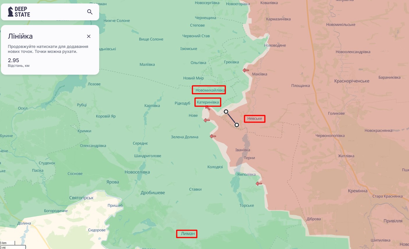 На карте DeepState по состоянию на 8 апреля обозначено изменение конфигурации линии боев. Карта показывает, что враг продвинулся от села Невское Луганской области до села Катериновка Донецкой области. Ориентировочное продвижение — почти 3 км.
