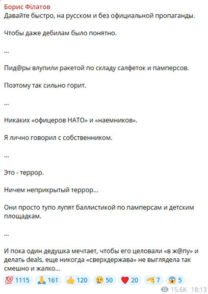 "Давайте быстро, на русском и без официальной пропаганды. Чтобы даже деб***м было понятно… Пи***ры влупили ракетой по складу салфеток и памперсов. Поэтому так сильно горит. Никаких "офицеров НАТО" и "наемников". Я лично говорил с собственником", — проинформировал градоначальник.