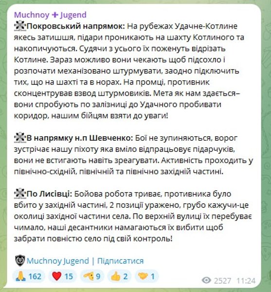По его информации, на Покровском направлении на рубежах Удачное — Котлино сейчас воцарилось определенное затишье — оккупанты начали проникать в шахту Котлиного и накапливать там силы, что свидетельствует о том, что они имеют целью отрезать Котлиное.