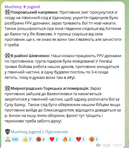 По его информации, противник смог продвинуться с востока на северо-восток в селе Удачное. Силы обороны здесь смогли "разобрать" укрытие российских оккупантов FPV-дронами. Там продолжаются бои и вражеские накаты.