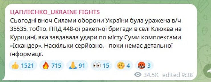 "Сегодня ночью Силами обороны Украины была поражена в/ч 35535, то есть, ППД 448-й ракетной бригады в селе Клюква на Курщине", — сообщил он.