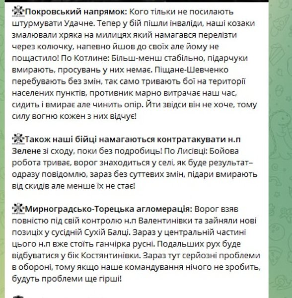 "Враг взял полностью под свой контроль Валентиновку и занял новые позиции в соседней Сухой Балке. Сейчас в центральной части этого населенного пункта уже стоит тряпка р*сны. Дальнейшее движение будет происходить в сторону Константиновки. Сейчас здесь серьезные проблемы в обороне, поэтому если наше командование ничего не сделает, будут проблемы еще хуже", — проинформировал он.