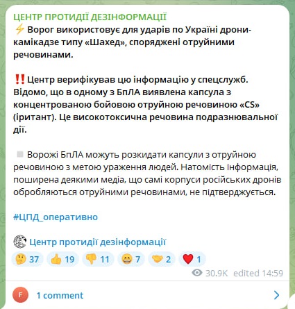 "Известно, что в одном из БПЛА обнаружена капсула с концентрированным боевым отравляющим веществом "CS" (иритант). Это высокотоксичное вещество раздражающего действия. Вражеские БПЛА могут разбрасывать капсулы с ядовитым веществом с целью поражения людей. Зато информация, распространенная некоторыми медиа, что сами корпуса российских дронов обрабатываются ядовитыми веществами, не подтверждается", — отметили в ЦПД.