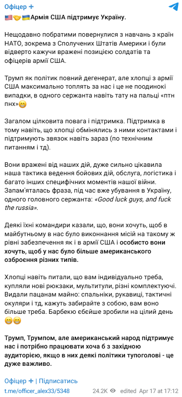 Лейтенант Вооруженных сил Украины с позывным "Алекс" поделился впечатлениями побратимов, которые вернулись с учений в Соединенных Штатах Америки. По словам бойцов, многие солдаты и офицеры армии США поддерживают Украину, хотят, чтобы Силы обороны получали больше американского вооружения, и оставляют украинцам свои контакты, чтобы быть на связи.