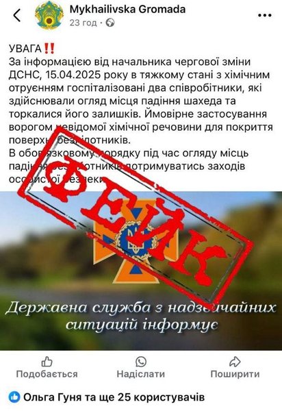 Так, в Государственной службе по чрезвычайным ситуациям опровергли информацию, которую стали на днях распространять в сети. Речь шла о случае отравления двух сотрудников ГСЧС, которые в тяжелом состоянии попали в больницу после осмотра места падения "Шахеда" на территории Полтавской области.