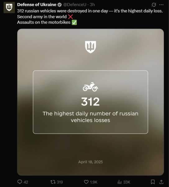 Однако стоит подчеркнуть, что показатель потерь российской армии на сегодня в 312 машин касается преимущественно мотоциклов.
